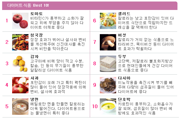단백질과 비타민, 무기질은 풍부하면서 열량은 매우 낮은 건강식을 섭취하게 됩니다.