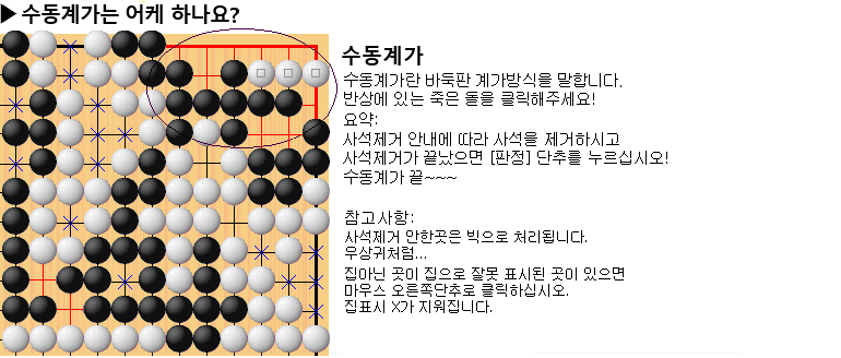 ![]() 대기실의 대기자 (대기+친선) 명단을 더블클릭하면 아래의 대국신청화면이 나옵니다. 대국신청화면은 ① 대국을 신청할 때나 ② 대국신청을 접수했을 때나 어느 경우나 동일한 화면이 나옵니다. 변경할 곳이 있으면 변경한 후 [확인] 단추를 누르세요! 대국신청이 상대에게 전송됩니다. 상대가 동의하면 대국이 성사됩니다. ![]() ![]() Q. 위의 대국신청화면에 "덤베팅"이란게 있는데 이건 뭔가요? 예로써 "덤을 9.5를 줄테니 내게 흑을 넘겨주시오"하는 하나의 흥정입니다. 덤베팅은 덤을 "9.5-8.5-7.5" 3가지로 베팅할 수 있습니다. ![]() "로그인=재입실=재접속=이어두기"는 통신에 빨간불이 켜졌을 때 사용합니다.통신에 빨간불이 켜졌으면 대국실을 그대로 켜둔채 [로그인]을 한번 더 해주세요! →자세히보기 로그인하면 통신이 초록불로 바뀌면서 끊어진 바둑을 재접속하고 대국을 계속합니다. 다른 컴퓨터에서 로그인해도 됩니다. 로그인한 컴퓨터로 대국을 "이어두기" 합니다. [로그인]할 때는 [대국실 나가기]를 누르지 않도록 조심하십시오. [나가기]를 누르면 그 즉시 대국이 종료됩니다. ![]() 양 대국자가 모두 [착수포기]를 하거나 [계가신청]을 하면 계가(計家)에 들어갑니다. 계가는 자동계가와 수동계가 두가지 방식이 있습니다만 바둑월드에서는 자동계가를 기본으로 하고 있습니다. 자동계가는 "사석제거와 집계산" 모두를 인공지능이 하므로 대국자는 신경쓸 일이 없습니다만... 수동계가는 "사석제거(=사석지정)"를 대국자가 해주어야 합니다. ![]() ![]() 수동계가란 바둑판에서 하는 계가방식을 말합니다. 바둑화면에 있는 죽은 돌을 클릭해주면 사석이 제거되는데 이게 수동계가입니다. 사석제거가 모두 끝났으면 [판정] 단추를 누르세요. 수동계가 끝~~~ ![]() 자동계가는 아무런 멘트 없이 순식간에 판정이 끝나지만, 수동계가는 사석을 지정하라는 메세지가 먼저 나옵니다. 그러므로 계가가 수동계가로 진행되는지, 자동계가로 진행되는지는 바로 식별이 가능합니다. 수동계가가 싫거나 사석지정이 싫으면 [자동계가] 단추를 눌러주세요! → 바로 자동계가로 바뀝니다.^^ ![]() 수동계가는 대국자가 사석을 제거한 후 [판정] 단추를 누르면 그 상태에서 컴퓨터가 판정을 해줍니다. 그러므로 사석제거를 제대로 하지 않거나 엉터리로 하면 수동계가는 당연히 엉터리가 됩니다. 이는 시스템 잘못이 아니고 대국자가 사석제거를 잘못한데서 나오는 결과입니다. ![]() ![]() 나는 자동계가로 신청했더라도 상대가 수동계가로 신청했으면 계가는 수동계가로 진행됩니다. 수동계가에서는 대국자가 사석지정을 해줘야 하는데...그걸 안하면 계가는 엉터리가 되고 승패도 엉터리가 됩니다. 수동계가가 싫거나 사석지정이 싫으면 [자동계가] 단추를 눌러주세요! → 바로 자동계가로 바뀝니다.^^ ![]() 계가진행이 평소와 달라도 [자동계가] 단추 누르세요! 누르는 순간 자동계가로 바뀝니다.^^ ![]() ![]() 판정이 잘못났을 땐 [재판정]을 누르십시오! 공개판정에서 판정을 다시 받습니다. 재판정은 "자동계가오류+시스템오류"에 한정합니다. 수동계가 오류는 대국자 잘못이므로 재판정 대상이 아닙니다.ㅠㅠ ![]() ![]() 제한시간(Time Limit) 바둑월드는 "대국시간*착수시간" 두가지로 시간제한을 합니다. 예로써, "15분*3분" 표시는 대국시간 15분에 착수시간 3분을 나타냅니다. 일반 시합대국처럼 착수에 시간제한을 두지 않으려면 "착수시간=없음"으로 하면 됩니다. "착수시간=없음"으로 설정하면" 1수착수"에 대국시간 전부를 써도 좋습니다. 대국시간/착수시간, 어느쪽 시간을 넘기든 "시간패" 입니다. ![]() 초읽기(Count Down) 대국시간을 다 쓴 경우는 (기본) 30초*3회 초읽기가 시작됩니다. 초읽기에서는 30초 이내에 착수를 하면 30초(IIIIII30초IIIIII)를 사용하지 않은 걸로 합니다. 30초가 지난 후 착수를 하면 30초(IIIIII30초IIIIII) 하나를 사용한 것으로 합니다. 30초(IIIIII30초IIIIII) 3개를 다 쓰고도 착수를 않으면 시간패가 됩니다. 마지막 30초는 빨강색(IIIII30초IIIIII)으로 표시됩니다. ![]() 추방대국은 상대의 항복을 받지도 않은채 대국도중에 게임이 중단된 대국입니다. 이렇게 비정상적으로 중단된 대국은 규정상 무효대국으로 처리됩니다. 무효대국은 노게임으로 "승"이 없습니다. 대신 장난친 상대는 "1급강등+벌점"이 주어집니다. ![]() ![]() ![]() 바둑을 두는 도중에 또는 승패판정이 나기 이전에 [한판더/재대국] 신청을 하거나, 졌습니다, 잘두었습니다, 잘배웠습니다, 감사합니다...식의 졌다는 투의 인사말이나 대화글을 올리거나, [계가/승부판정] 신청을 받고도 60초가 지나도록 동의하지 않고 버티면 패(敗)로 처리합니다. WiFi 신호가 약하면 무선접속 쓰지 마세요! 무선접속은 신호가 약하면 돌의 지연시간이 크게 증가합니다. 돌의 지연시간 합계가 100초를 넘어가면 대국이 차단될 수 있습니다. ㅠㅠ ![]() 나, 엘리트 맞아? |