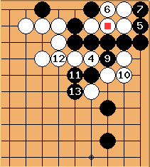 Because this was a league game, both players were awarded half a point towards their league scores, a rather happy ending. In other situations, a replay might be ordered. Example 3 Follow this link to view the game: The third example is a game between Uchida Shuhei 3-dan and O Meien 9-dan. While the previous eternal life example happened in yose stage, this one was during mid-game. And it was once again an eternal ko! ![]() = , =![]() The players had been fighting a messy approach ko at upper-left corner.