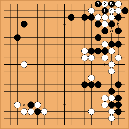 Because this is a major tournament final, there were multiple live commentaries on the internet. Hong Seongji 8-dan of Korea commented: "I think B101 is a mistake. Black would suffer a loss locally". But is that really the case? In a separate live commentary, Li Ang 3-dan of China explained: "B101 chose this ko fight to prevent white from using the local threats". ![]() a and b are local ko threats for white As can be seen, if black chooses the textbook solution, white can make use of the local threats at 'a' and 'b'. Normally these external conditions, such as local ko threats and aji around the life & death problems, cannot be easily factored in in textbook problems. That is why I favour using real games to study life & death problems. |